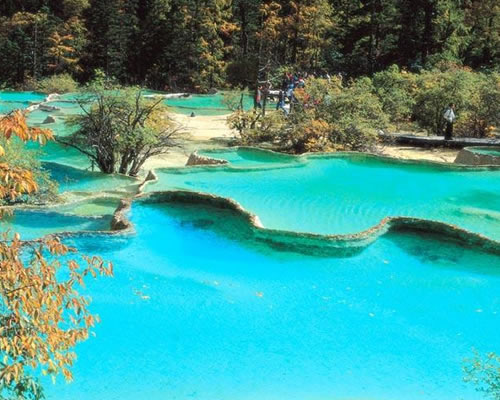 水池大的一、两亩,小的几平方米,如蹄、如掌、如菱角、如宝莲、千姿百态。巨大的水流,沿沟谷漫游,注入梯湖彩池,层层跌落,穿林、越堤、滚滩。进沟的第一池群,掩映在一片葱郁的密林之中,穿过苍枝翠叶,20多个彩池参差错落,波光闪烁,层层跌落,水声叮咚;有的池群池埂低矮,池水漫溢,池岸洁白,水色碧蓝,在阳光照射下,五彩缤纷。有的湖中古木老藤丛生,如雄鹰展翅,似猛虎下山,惟妙惟肖,栩栩如生;有的池中生长着松、柏等树木,或高出水面,或淹于水中,婀娜多姿,妩媚动人,形似“水中盆景”。