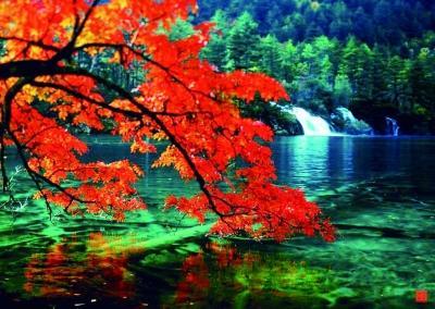 浪漫的秋风也吹来了九寨沟最为灿烂的季节。树叶除了绿色以外,还呈现出金黄、火红等色彩,五彩缤纷,倒映在明丽的湖水中,湖山同色,湖水也斑斓似锦了,一时间竟然不能分清哪里是山哪里是水,十分迷人。